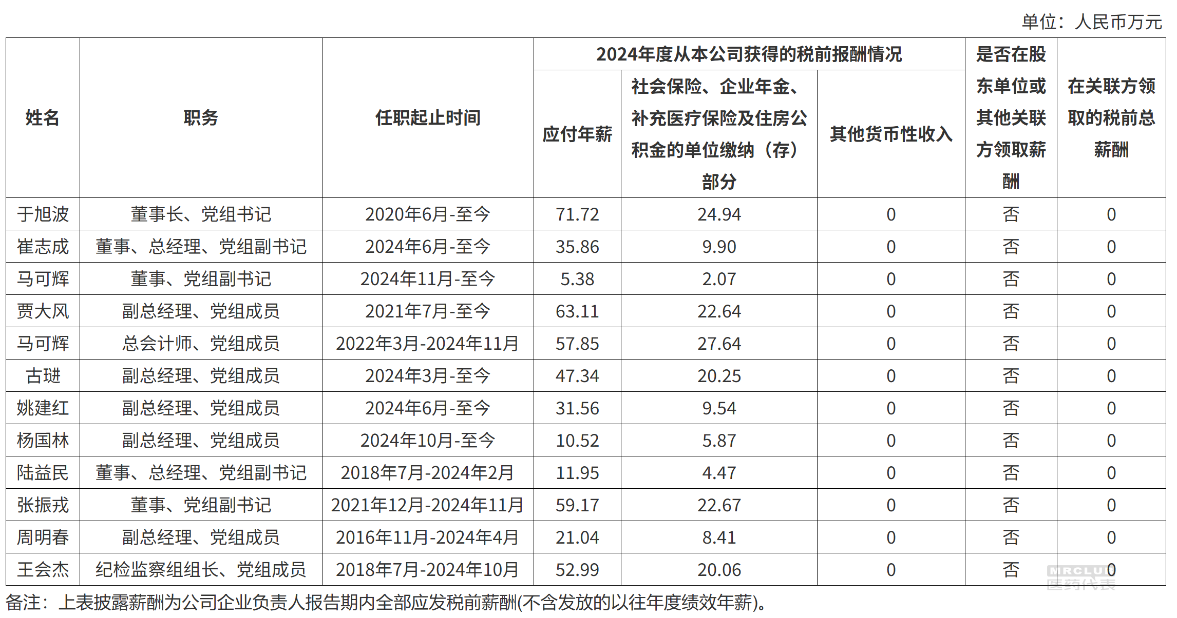 最后说下通用技术,中国通用技术(集团)控股有限责任公司披露了 12 名高管的薪酬信息,2024 年,通用技术集团董事长于旭波税前年薪为 71.72 万元,总经理崔志成为 35.86 万元,其他人员详情见薪酬表: